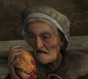 Isn’t this the same person I met at Shani’s house? And in the swamp? Strange how you never see them in the same room together. When I first saw an old woman in the game, I was impressed that the effort had been made to make her look aged, instead of just putting different skin complexion on a young body model (Wynne from Dragon Age, I’m looking at you). I was disappointed when I found out that it had only been done once: all old women look exactly the same.